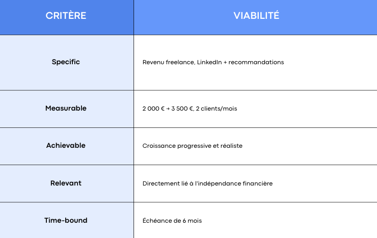 « Je vais augmenter mes revenus mensuels en freelance de 2 000 € à 3 500 € en acquérant deux nouveaux clients par mois grâce à la prospection sur LinkedIn et aux recommandations, au cours des six prochains mois. »